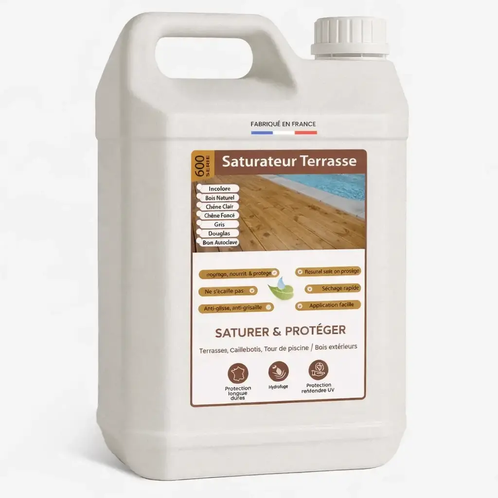 Le saturateur terrasse ST600 est conçu pour protéger et valoriser les terrasses ainsi que tous les revêtements extérieurs en bois (zones autour des piscines, marches, caillebotis, etc.) face aux intempéries, à l’humidité et aux rayons UV. Simple d’entretien, il pénètre en profondeur dans le bois afin de le nourrir durablement et de renforcer sa résistance. Ce produit est proposé en formats de 1, 2, 5 ou 10 litres, avec un large choix de teintes.